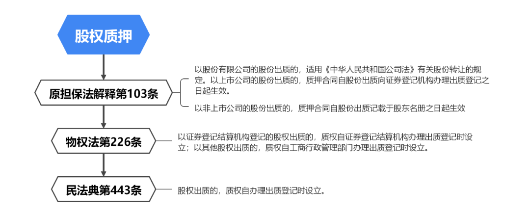 答:股权质押设立的直接规定,从大的层面经历由原《担保法解释》第103条、原《物权法》第226条至《民法典》第443条的变化。