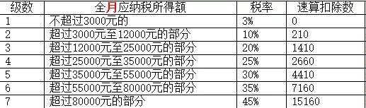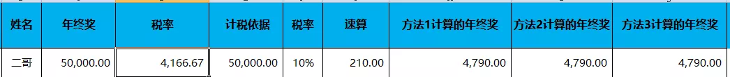 年终奖个税=50000*10%-210=4790