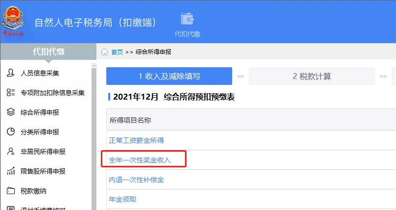 2、进入全年一次性奖金收入,记住这里不能在工资薪金所得里面申报,如果在工资薪金申报,那就是并入工资薪金申报方式了,不是单独计税了。