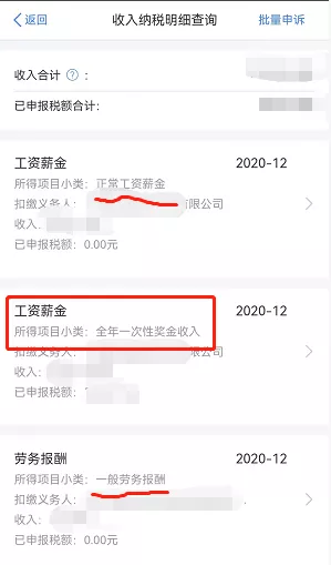 如果你发了年终奖,扣缴单位也按照一次性年终奖给你申报了,你在你自己的个税APP就能看到这样一条记录。