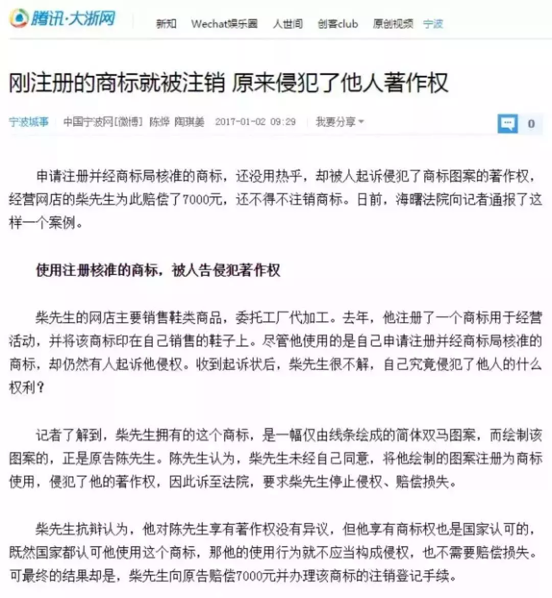 案例:浙江一位经营网店的柴先生,注册了一个商标并已通过商标局核准下证,但没使用多久,却被人起诉侵犯了著作权(及版权),柴先生为此赔偿了7000元,还不得不注销商标。