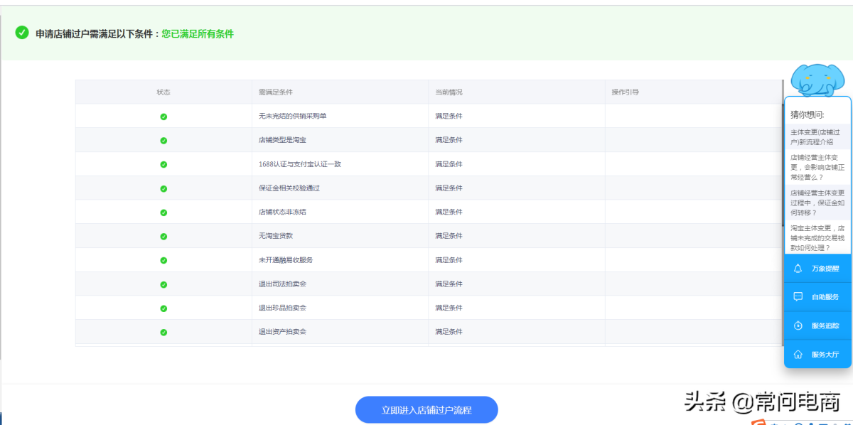 首选进入过户检测页面,系统会提示满足或不满足过户条件,如果满足可以直接进入过户流程,如果不满足会列出需要满足的项,需要处理后再重新检测
