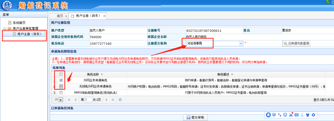 系统跳转“用户注册审批管理”,点击“用户注册(政务)”,选择“注册提交机构”为河池海事局,勾选“角色名称”,行政相对人选“1.外网业务申请角色”、“2.无线电外网业务申请角色”即可,点击“提交审核”,等待海事管理机构审核通过。如下图所示: