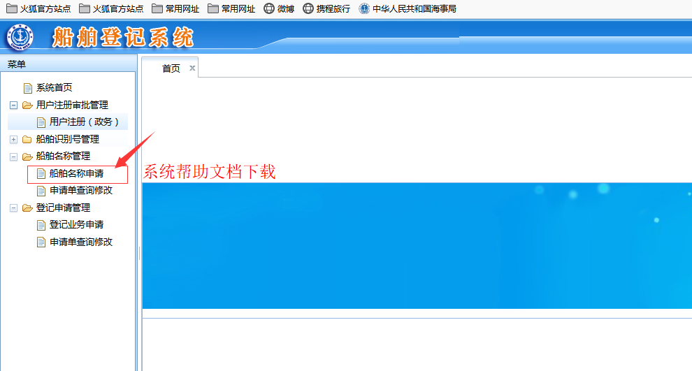 1.选择“船舶名称核准”,点击“在线办理”,系统跳转到下一个界面后,选择“船舶名称管理→船舶名称申请”。如下图所示