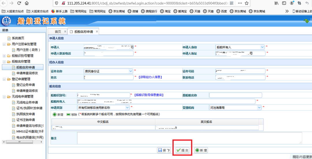 2.页面跳转填写申请信息红色星号表示该项必录入(英文船名需填大写拼音),核对无误后,点击保存系统将保存用户录入的信息,然后点击提交。如图所示: