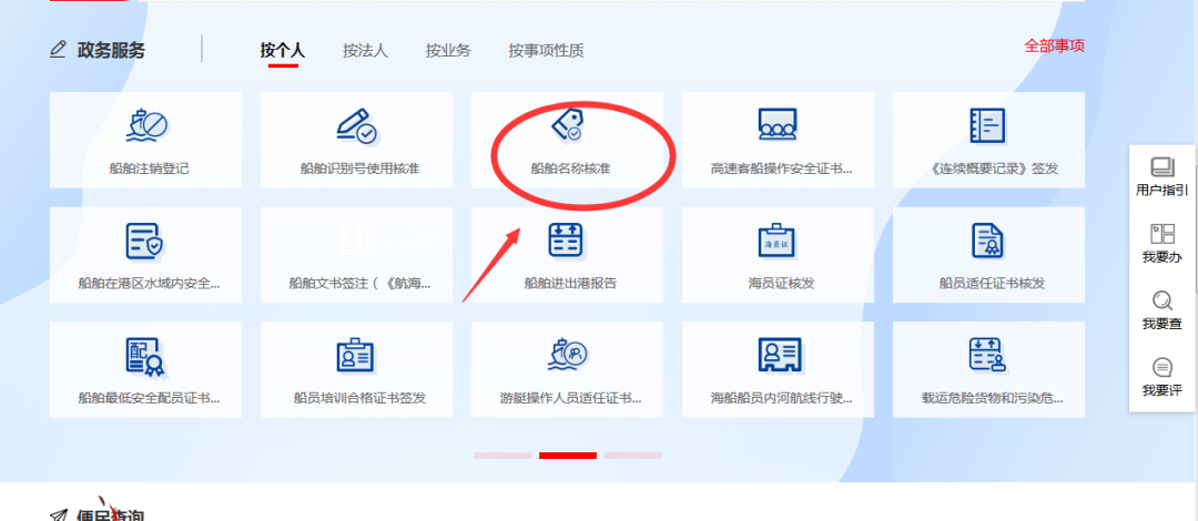 账号注册成功后,进入海事“一网通办”平台主界面,点击“船舶名称核准”,页面跳转点击“在线办理”