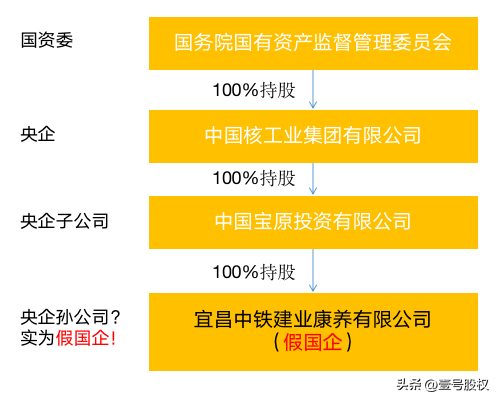 虽然国资委说这些假国企和中央企业无任何隶属关系和股权关系,但是笔者通过公开信息查询到,这些公布的假国企大多和中央企业存在股权关系,而且股权关系还不弱。比如这份假冒国企名单中的第一家企业“宜昌中铁建业康养有限公司”,这家公司现在的唯一股东是“中国宝原投资有限公司”,后者的唯一股东是“中国核工业集团有限公司”,而中国核工业集团公司是国资委100%持股的央企。也就是说,宜昌中铁建业康养有限公司是央企中国核工业集团有限公司的孙公司,而且是100%持股的孙公司!