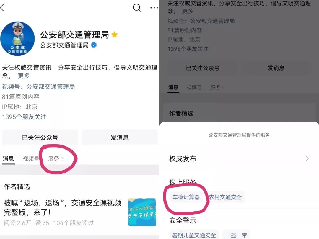 打开公安部交通管理局微信公众号主页,点击【服务】标签,然后点击【在线服务】栏目下的【车检计算器】