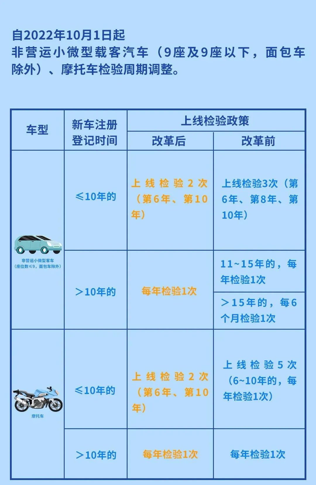此次调整后,非营运小客车、摩托车在10年内,只需要在第6年、第10年到检验机构上线检验,期间每两年申领一次检验合格标志;超过10年的,每年上线检验1次。
