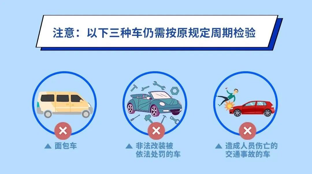 • 摩托车,将原10年内上线检验5次调整为检验2次(第6年、第10年),10年以后每年检验1次。