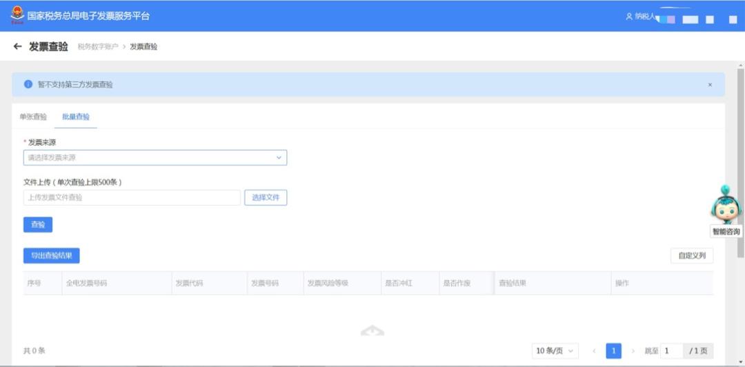 选择“发票来源”,根据发票来源选择下载“增值税发票管理系统发票批量查验模版”或者“电子发票服务平台发票批量查验模版”。在批量模板中填写发票信息,单次查验上限500条。