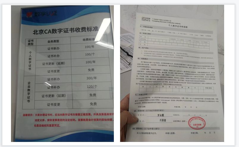 北京CA的收费标准(左一)和网政通申请表(右一)