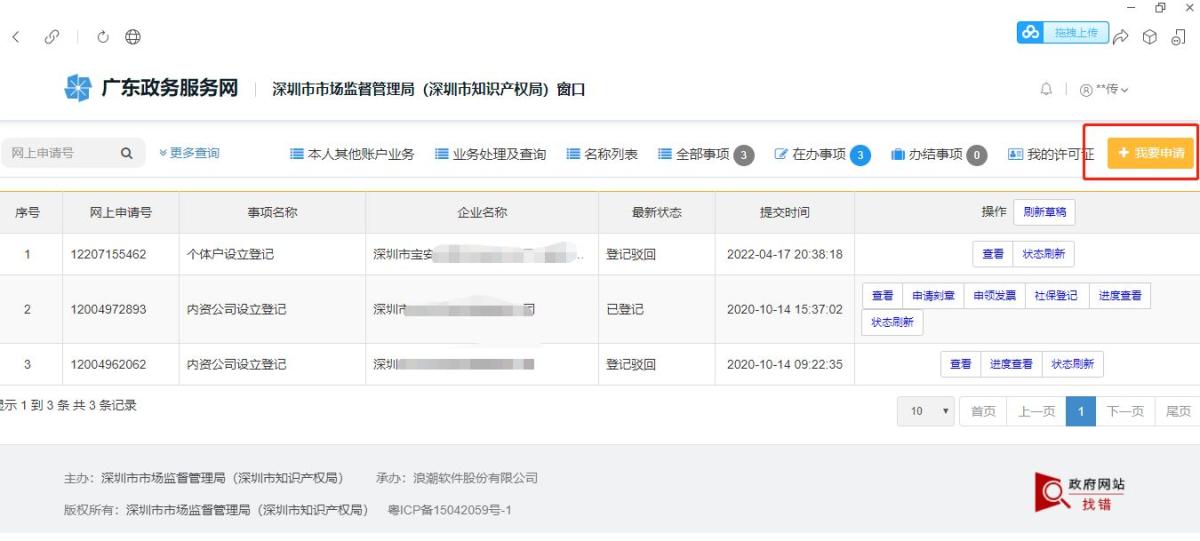 通过手机微信扫一扫,然后进行人脸识别后可直接接入操作页面“广东政务服务网(深圳市场监督管理局窗口)”然后选择“我要申请”如下图:
