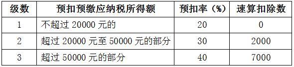 应纳税所得额:劳务报酬所得、稿酬所得、特许权使用费所得,以每次收入额为预扣预缴应纳税所得额。劳务报酬所得适用百分之二十至百分之四十的超额累进预扣率,稿酬所得、特许权使用费所得适用百分之二十的比例预扣率。