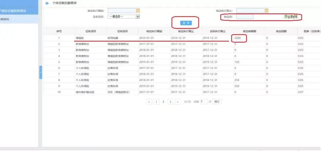 以下图为例输入好验证码后点击查询已查询出本单位所有定期定额信息,注意找到在有效期内的增值税月核定金额信息以备后面填写申报表。(下图所示可以看到实例单位定额核定是月定额5000,按季申报时销售收入就是15000未达起征点收入)