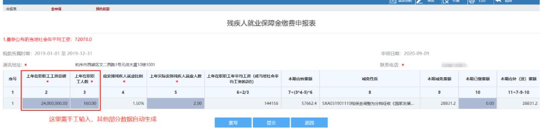 接上例,申报表在当地电子税务局填写,填写上年在职职工工资总额和上年在职职工人数,系统会自动计算,如下图: