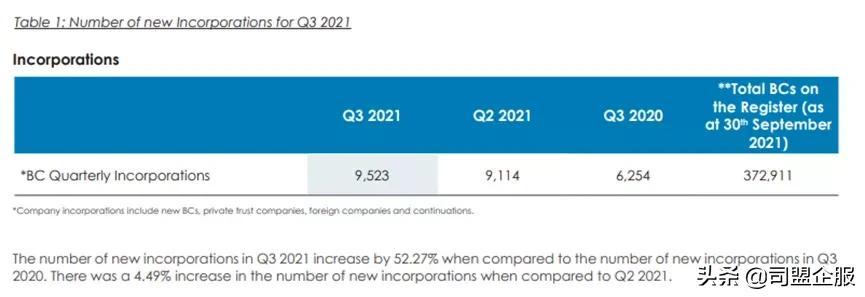 统计数据显示,2021年第三季度BCs(商业公司)新注册数量是9523家,环比增加409家,增幅为4.49%,同比增加2999家,增幅为52.27%。
