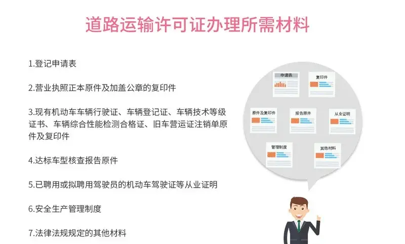 办理道路运输经营许可证需要交通局审核办理,要执照副本、公章、法人身份证扫描件、聘用驾驶员的驾驶证和从业资格证、还有安全生产管理制度文本(五项)、车辆拟购申请(就是什么样车、长宽高、载重量)。