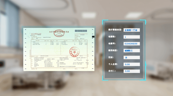 支持识别全国各地门诊/住院发票的业务流水号、发票号、住院号、门诊号等关键字段;支持识别收费项目明细,并可根据不同省市地区返回对应的识别参数。