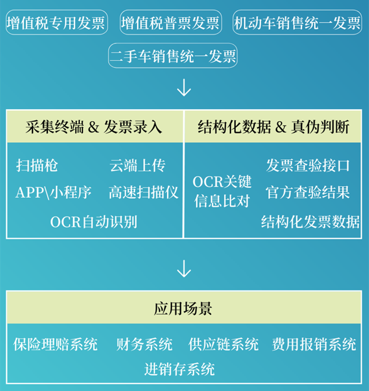 支持增值税发票、火车票、机打发票、船票、出租车票、机票行程单、过路费发票、滴滴出行行程单、国际小票、定额发票等近20种票面信息的识别与结构化提取,可与财务系统、业务报销系统、费控系统进行集成。