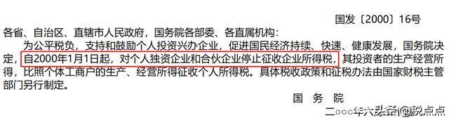 《国务院关于个人独资企业和合伙企业征收所得税问题的通知》(国发[2000]16号有明文规定:国务院通知对个人独资企业和合伙企业停征企业所得税,只对其投资者的经营所得征收个人所得税,是我国鼓励个人投资、公平税负和完善所得税制度的一次重大政策调整,既为个人独资企业和合伙企业的发展创造了条件,有利于国民经济持续、稳定、健康地发展,又是规范所得税制度的一项重要措施,有利于进一步加强所得税的征收管理。