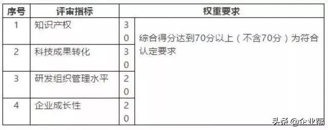 企业创新能力主要从知识产权、科技成果转化能力、研究开发组织管理水平、企业成长性等四项指标进行评价。各级指标均按整数打分,满分为100分,综合得分达到70分以上(不含70分)为符合认定要求。四项指标分值结构详见下表: