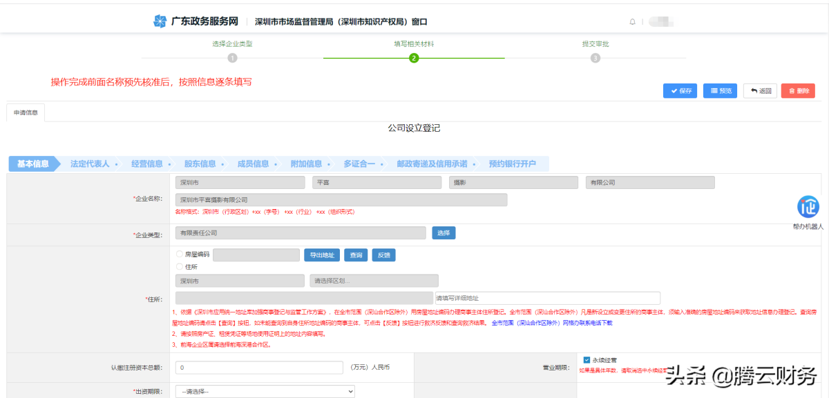 第十四步,操作完成签名名称预先核准后,按照信息追条填写。