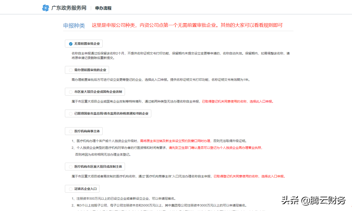 第九步 这里是申报公司种类,无特殊要求或特殊行业的 点击第一个无需前置审批企业