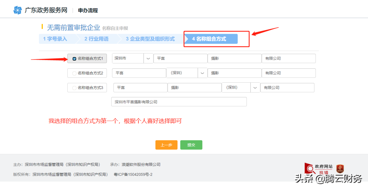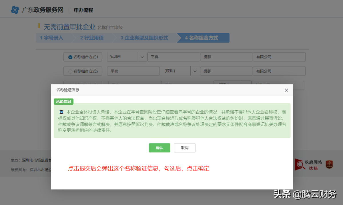 第十三 名称组合方式,看个人喜好选择,一般为深圳市XX贸易有限公司等等 点击提交后会跳出名称验证信息,勾选承诺信息后点击确认即可