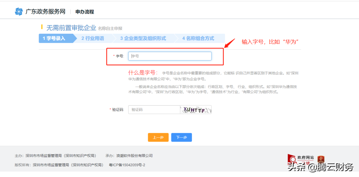 第十步 开始查询字号,可以在字号框输入自己想好的公司字号 比如“华为”