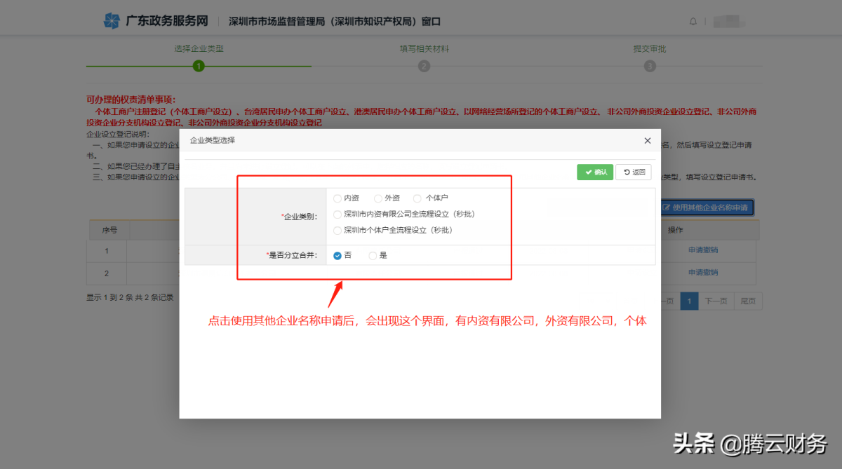 第六步 点击使用其他企业名称申请后 会跳出申请类型