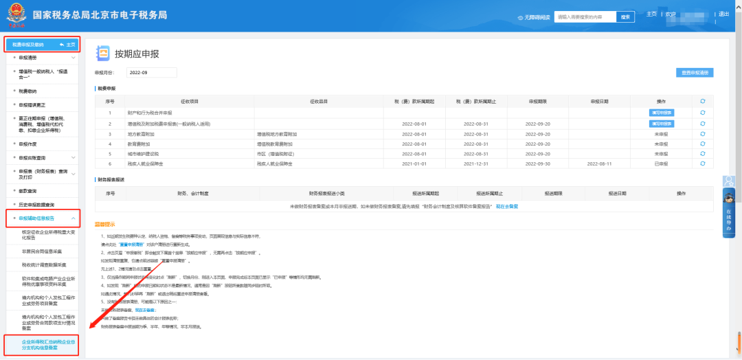 二、税费申报及缴纳—申报辅助信息报告—企业所得税汇总纳税企业总分支机构信息备案。