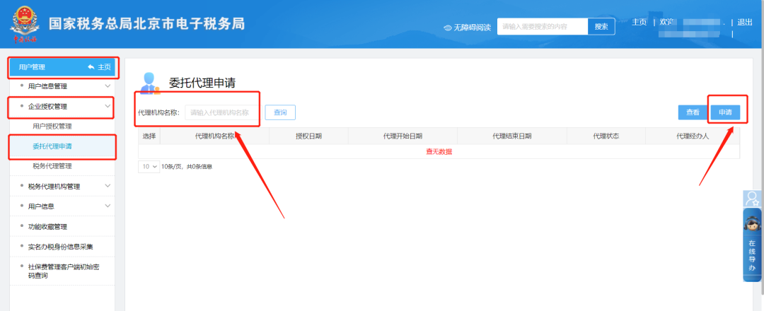 二、用户管理—企业授权管理—委托代理申请,点击“申请”,输入代理机构信息,可进行签约代理机构。