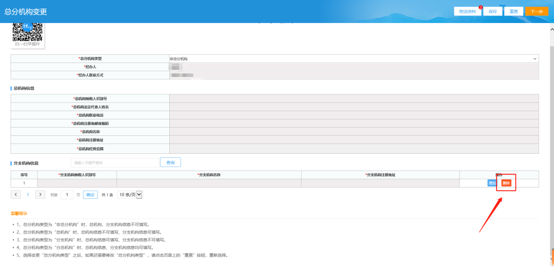三、删除注销的分支机构,同时修改“总分机构类型”。