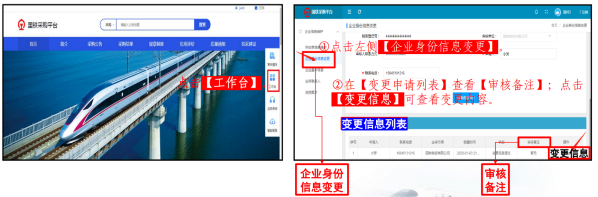 (2)用户在初审后,如需进行企业信息变更后的注册信息查询,可进入企业账号后,点击右侧【工作台】在【企业信息维护】下方点击【企业身份信息变更】,在弹出页面可查看【变更申请列表】相关内容。