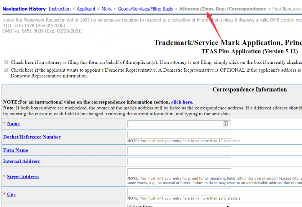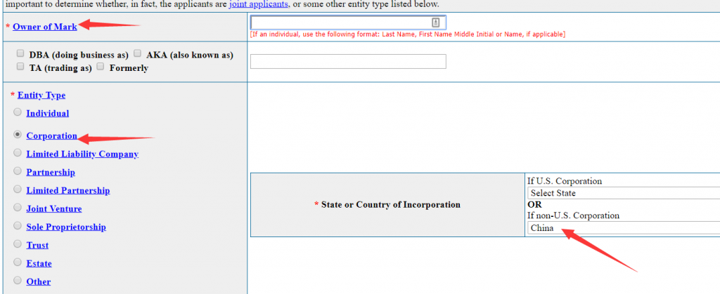 第二步: Applicant 加红星的要填,依次要填 Owner / Entity Type [一般选个人或公司】 PS: 非美国公司可以勾选 non-U.S. Corporation 【china]