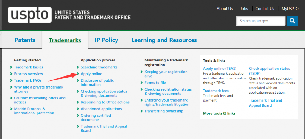 如何自注册美国商标? 第一: 进入商标申请页面 打开 美国商标局官网 打不开就复制链接: https://www.uspto.gov/ 点击 Apply Online 【在线申请】