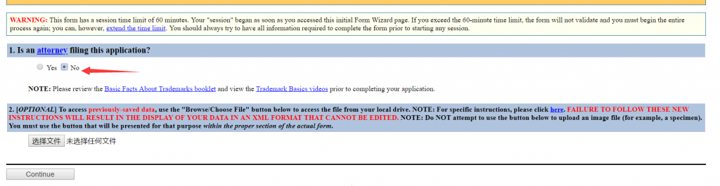 第二:开始商标申请 第一步: Instruction 商标局会问你是不是律师在申请,直接选No 就可以 ,然后点Continue