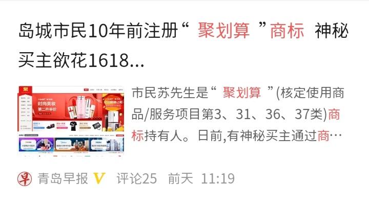 近日,小编在网上看到一则名为“岛城市民10年前注册“聚划算”商标 神秘买主欲花1618万元收购”的新闻。