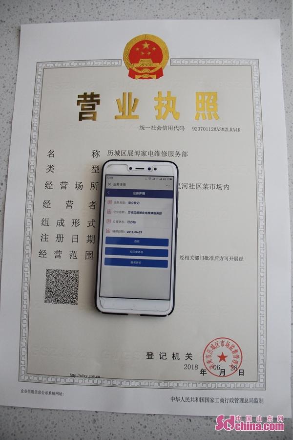 全市首张微信版个体户营业执照所有人,历城区展博家电维修服务部业主刘海龙深有感触地说,“现在政府的服务越来越贴心、越来越到位。微信办照模式开启后,我们只需要在家点点手机,再也不用到登记窗口‘面对面’提交材料啦,省下了我们大量的时间和精力。”