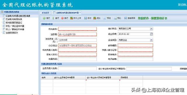 2、进入系统后选择总部机构代理记账资格申请菜单,按实际情况录入代理记账总部机构的相关信息;