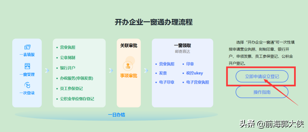 网上填报企业设立申请→驳回重新提交或直接审核通过→通过后领取营业执照→刻章→银行开户→期间可登录税务系统熟悉并绑定办税人。前海郭大侠银行开户下来基本上可以正常使用了。