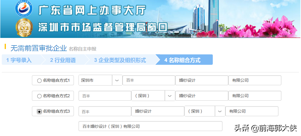 适用于自然人股东设立,深圳法人股东,全程在网上系统填报,用数字证书或银行U盾进行电子签名,无需到场, 需要提供:经办人、法定代表人、前海郭大侠各位股东和监事的银行U盾或数字证书;法人需要亲自来深圳办理。
