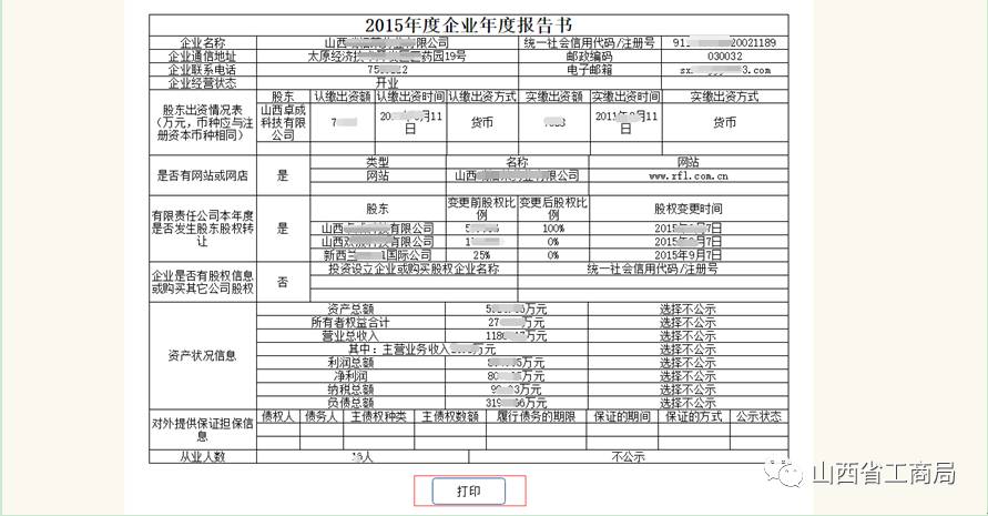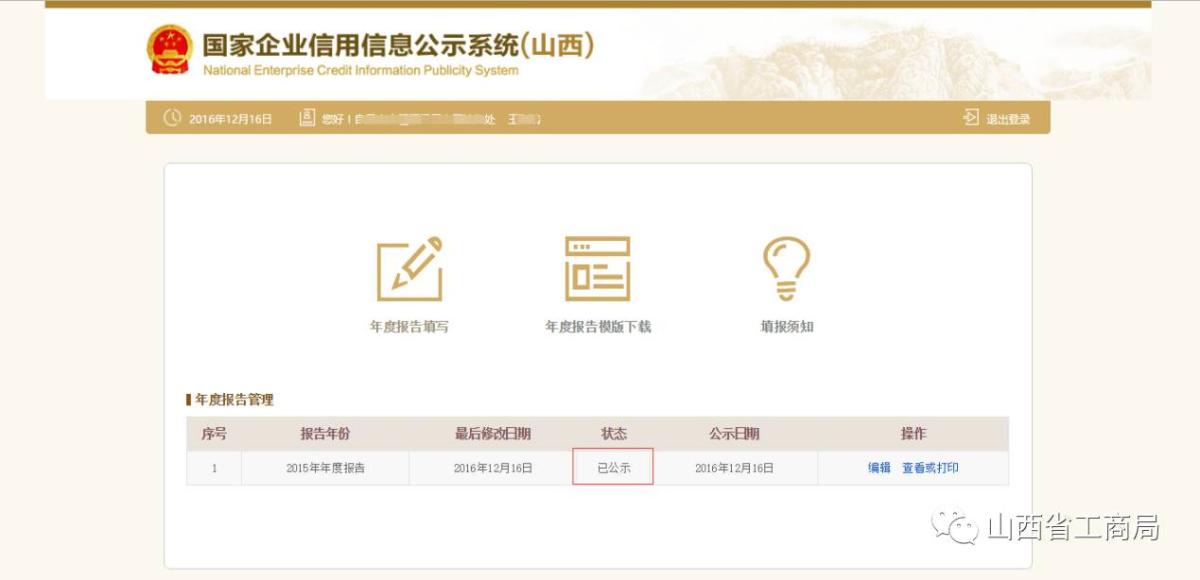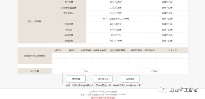 填写完毕后,点击【预览并公示】,查看填写的内容,确认无误后点击【提交并公示】,返回首页,年度报告管理处可看到状态是:已公示,也可点击【预览打印】 ,对年报信息进行打印,也可点击【返回修改】对年报内容进行修改。