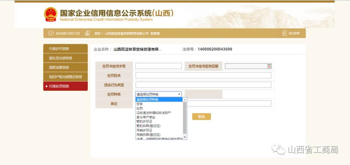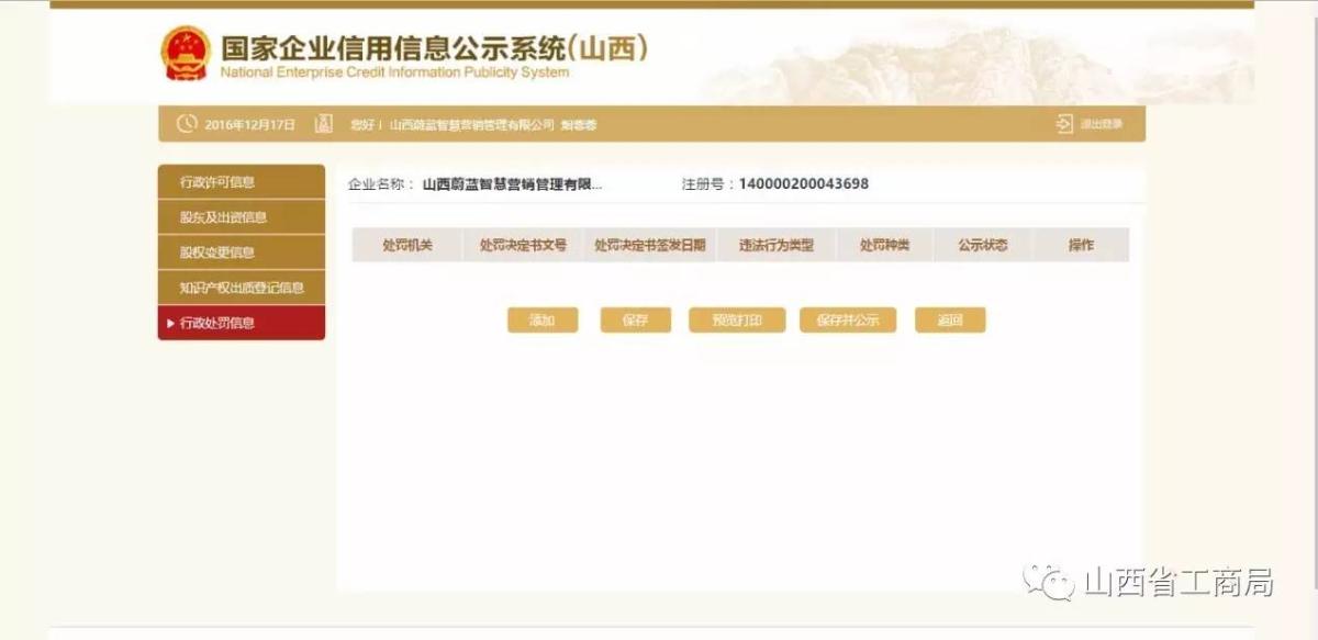 点击【添加】,填写行政处罚信息,点击【保存】。