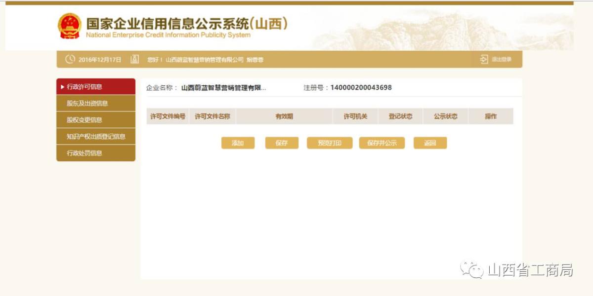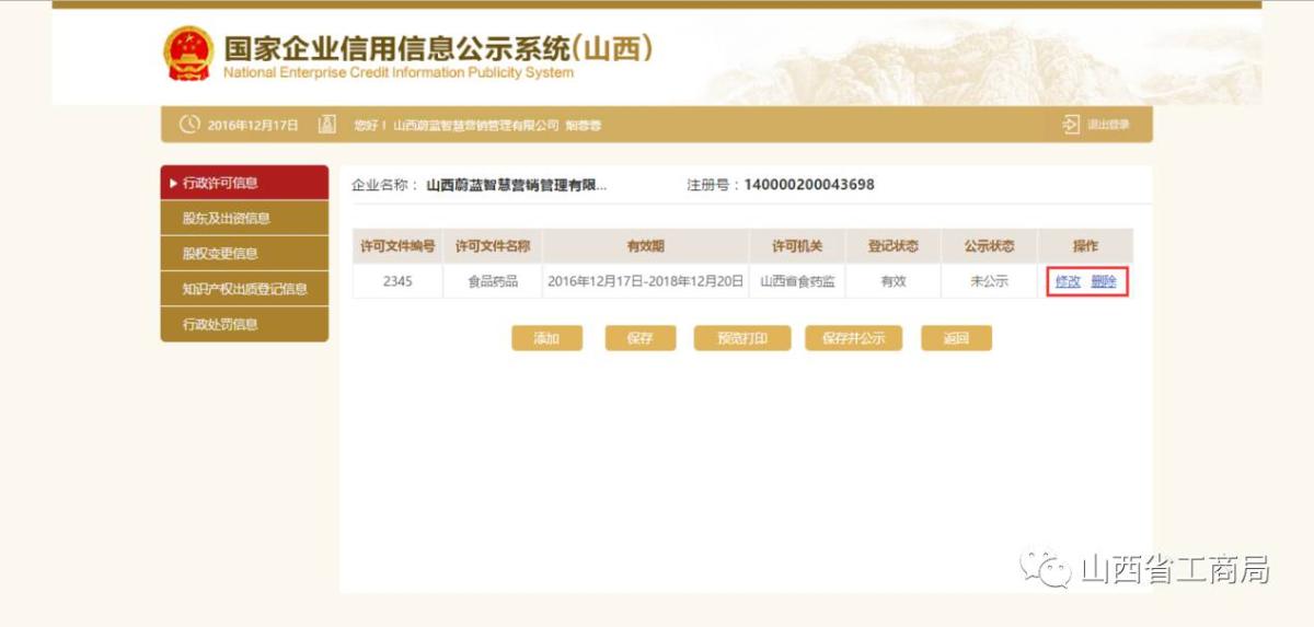 可对填写的许可信息进行修改、删除,确认无误后点击【保存并公示】,也可点击【预览打印】,进行打印。