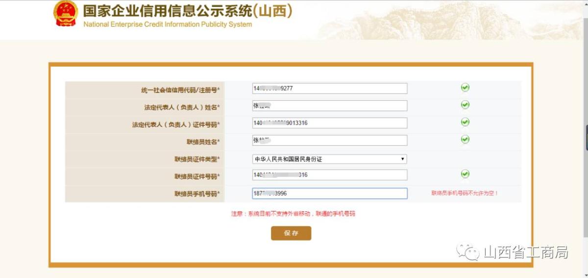 联络员注册时,输入统一社会信用代码或注册号、法人姓名、法人身份证号、联络员姓名、身份证号、以及手机号,点击【保存】