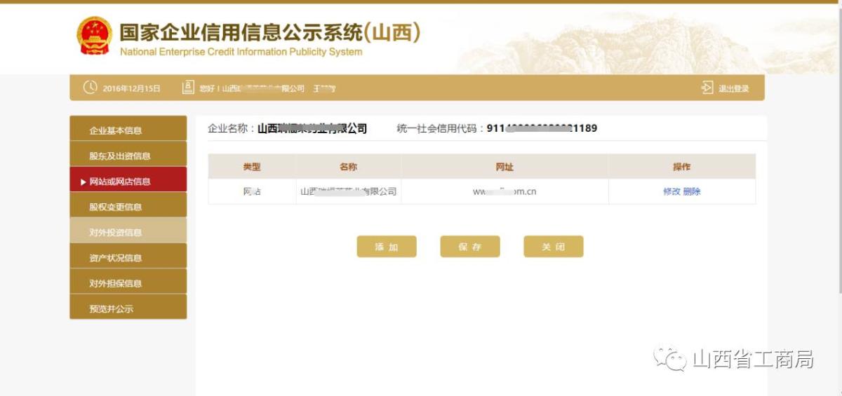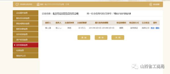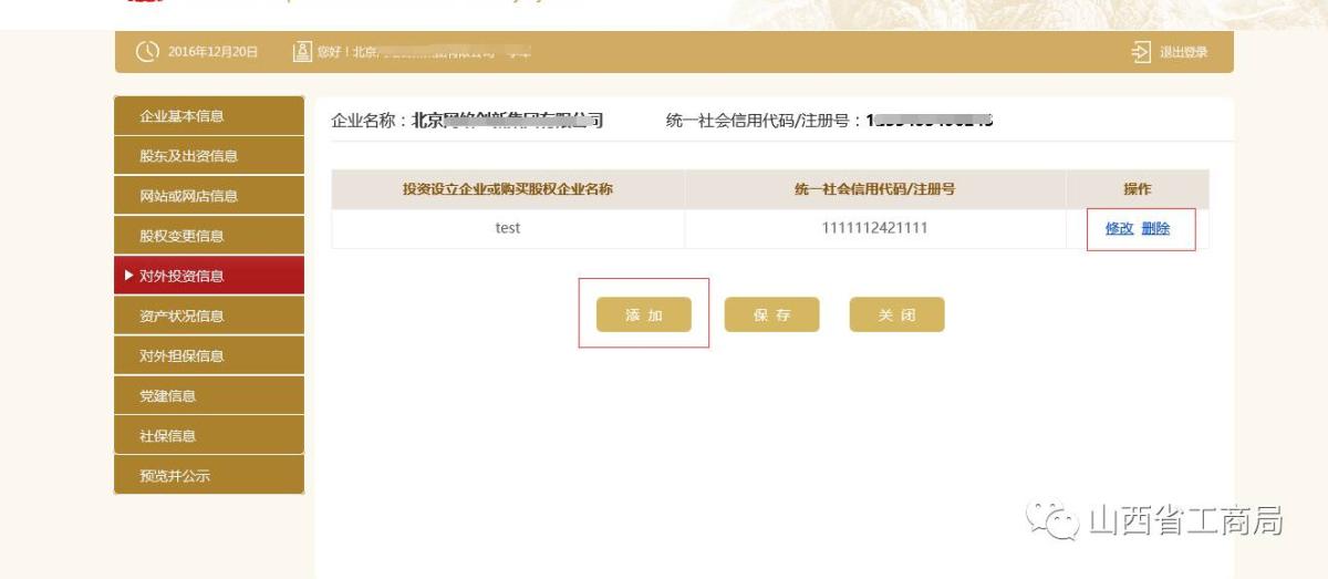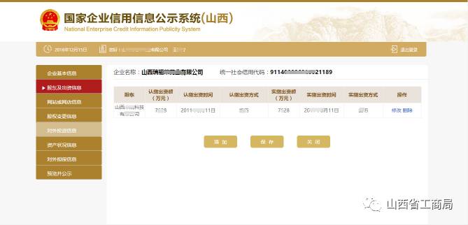 点击【添加】,输入对外投资信息,点击【保存】,对已填写的信息可进行修改、删除。