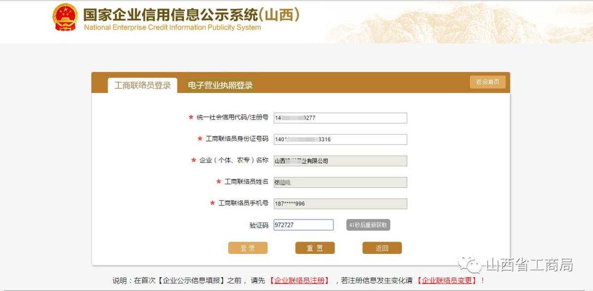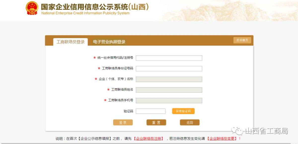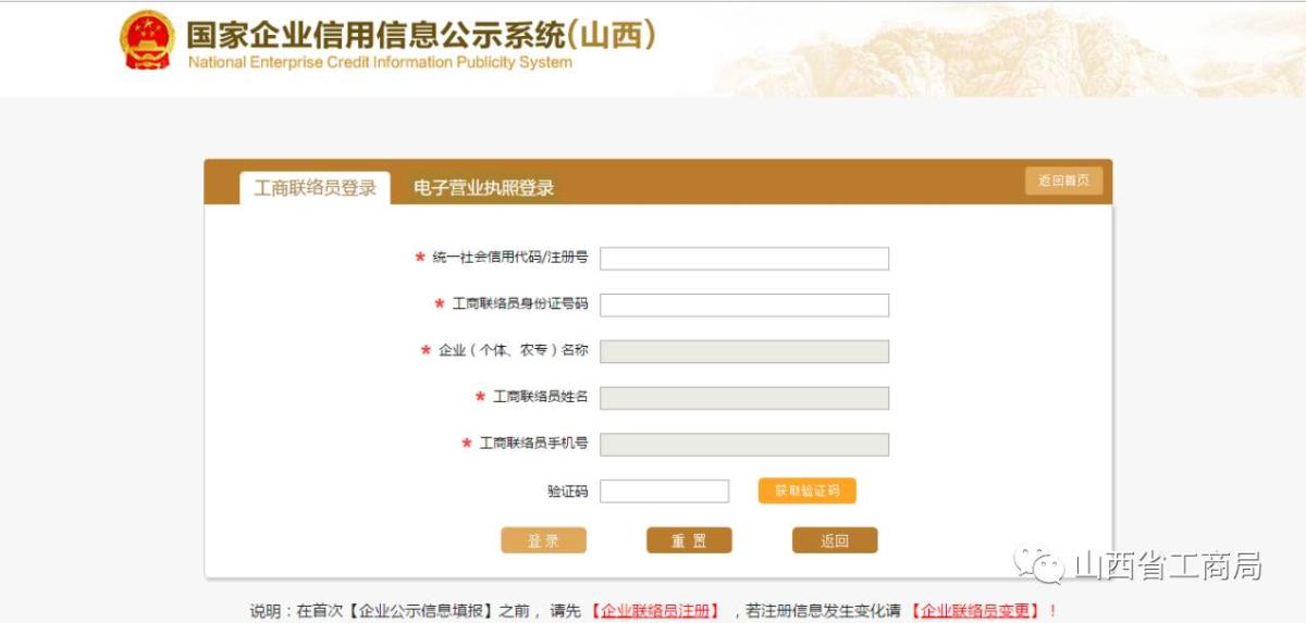 如果已经注册过联络员,直接输入统一社会信用代码或注册号,系统自动带出企业(个体、农合)注册号,输入联络员身份证号,系统自动带出联络员姓名跟手机号,点击【获取验证码】,输入验证码点击【登录】,进入填报界面。