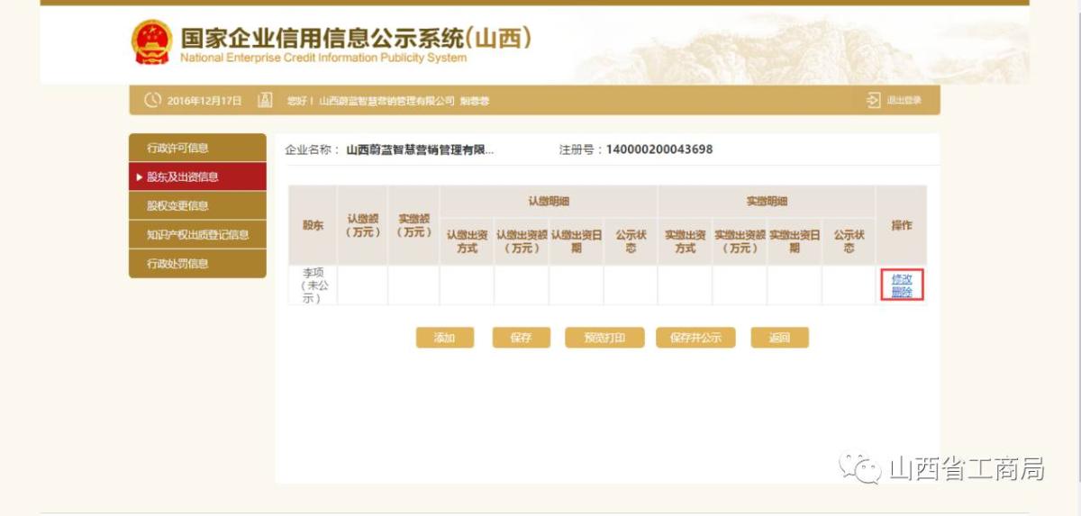 对已填写的股东及出资信息,可以进行修改、删除。点击【保存并公示】,也可点击【预览打印】进行打印。